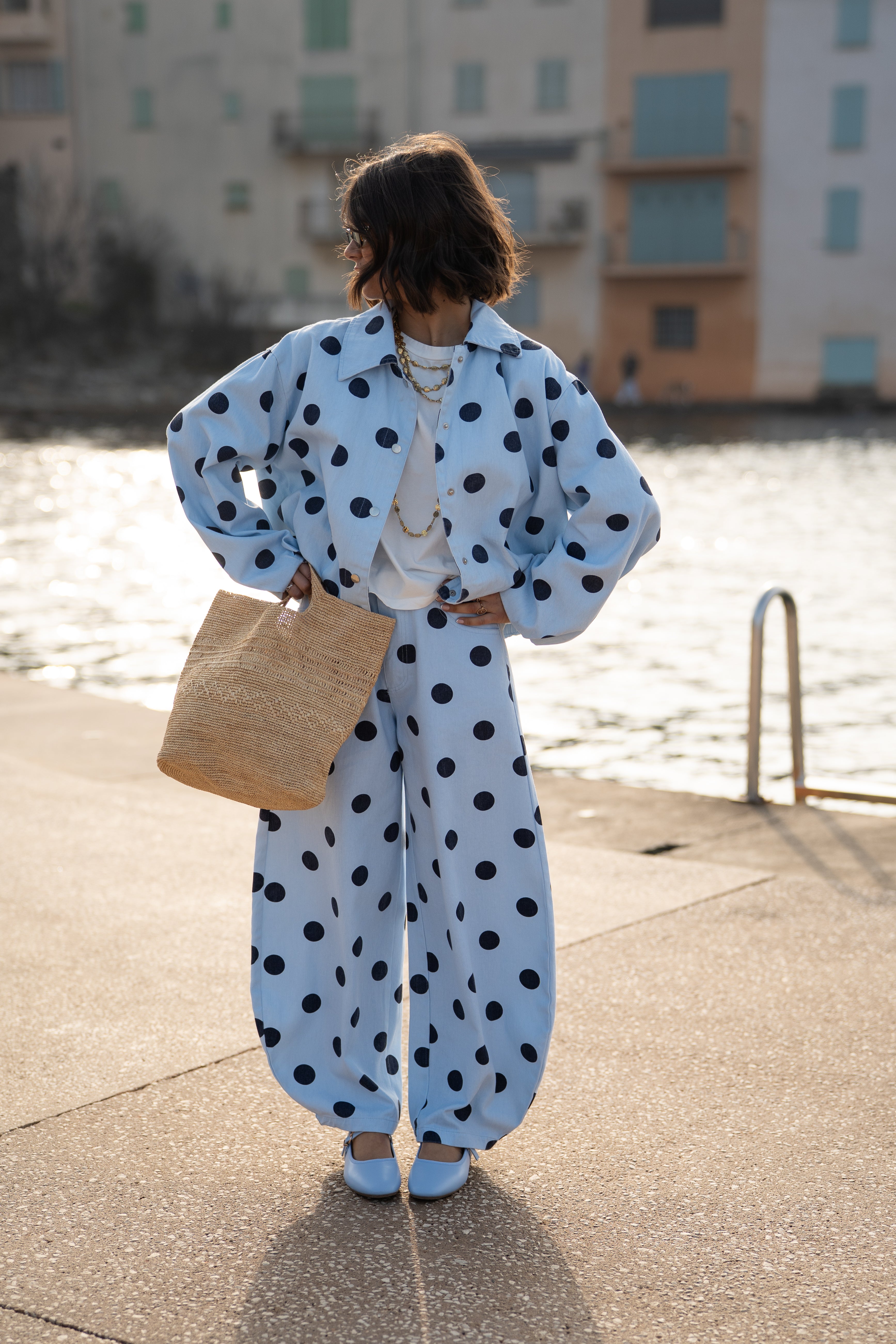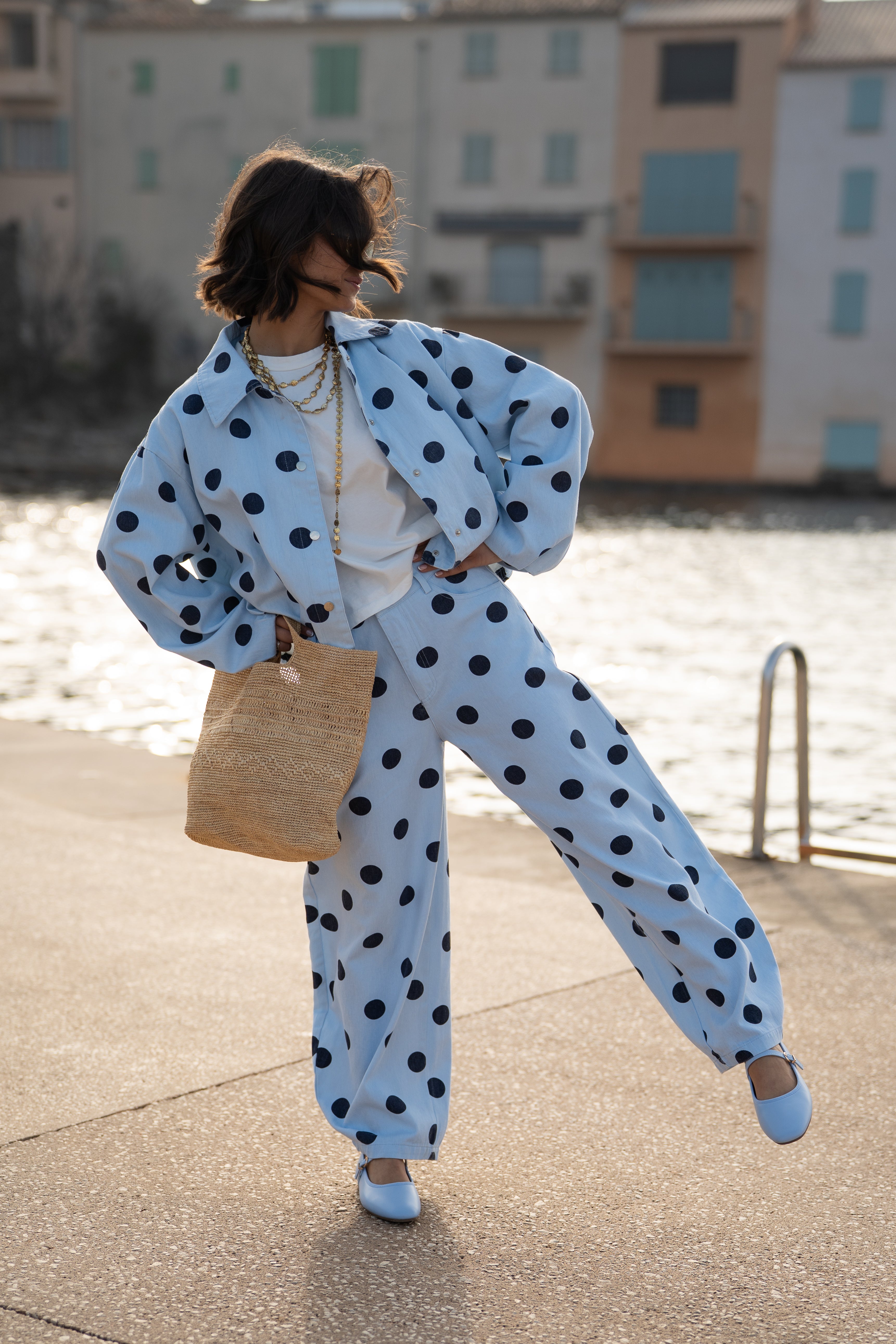 • Motifs de pois sur tout le jean.